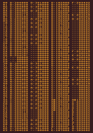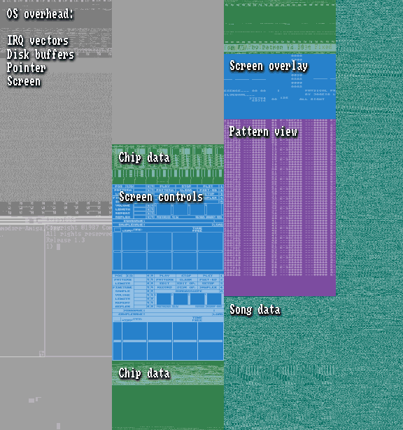 It’s not double-buffered; there’s only a single “sheet” of rendered pattern data in memory. It would be wasteful to do it differently, I guess, you need that precious chip RAM for samples! (On classic Amigas, all graphics and sounds must be in the same special memory region, and on an Amiga 500, it’s only 512 KB.) From address zero, the memory looks like this when a song is loaded: