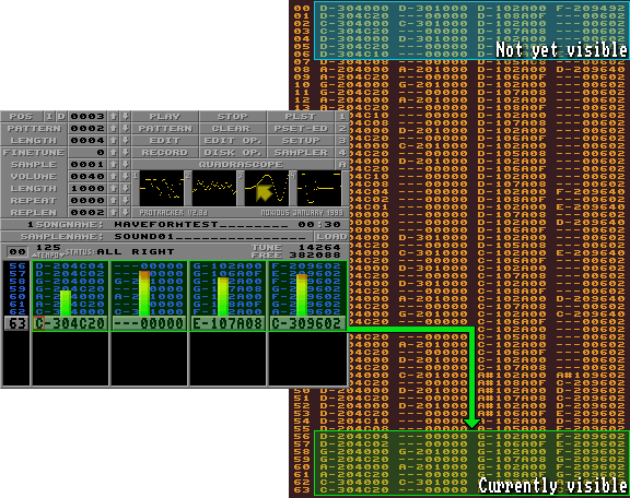 While testing my Coppenheimer update (still in progress), I loaded up ProTracker for testing. I started wondering how it paints the pattern data at the bottom of the screen (the song “contents”). Is it double-buffered? How fast can it redraw everything? (I know from experience that plotting little 8×8 characters with the CPU can get really slow – heck, it’s even slow in the browser without optimizations!) And does ProTracker pre-render the next pattern it will display?