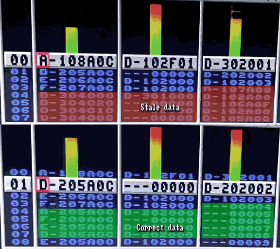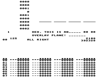 Another mid-screen change sets the position of the “pattern sheet” (starting at row 00 above). In other words: The scrolling-up is done by altering a pointer, nothing is redrawn for that. But what is redrawn, and how fast?