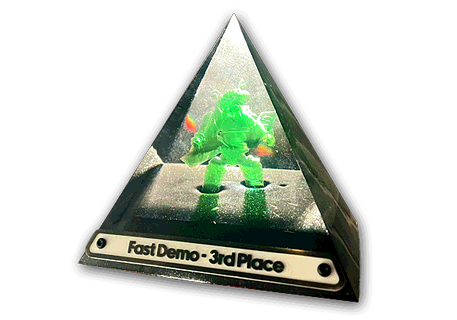 I also took part in the trophy compo and the fast compo, with an unrecognizable rotozoomer and a hastily scribbled animation, respectively. But I did win a sharp little trophy with that! (It’s actually razor-sharp around the edges…)