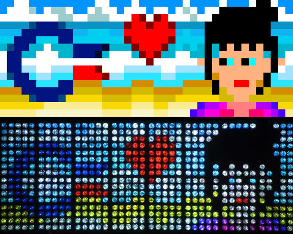 After watching last year’s entries for a bit, I wanted to do an animation that somehow incorporates the structure of the crates – the Mate wall isn’t an evenly distributed “pixel” array, there are gaps between the 5×4 blocks. That’s how I got the idea to do something with the music channel visualization from Dexion’s megademo – the original bars are already 4 pixels high.