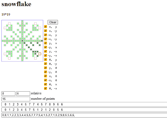 Many of the other entries don’t bother with coordinates and encode a quadrant of the snowflake as a bit pattern instead: